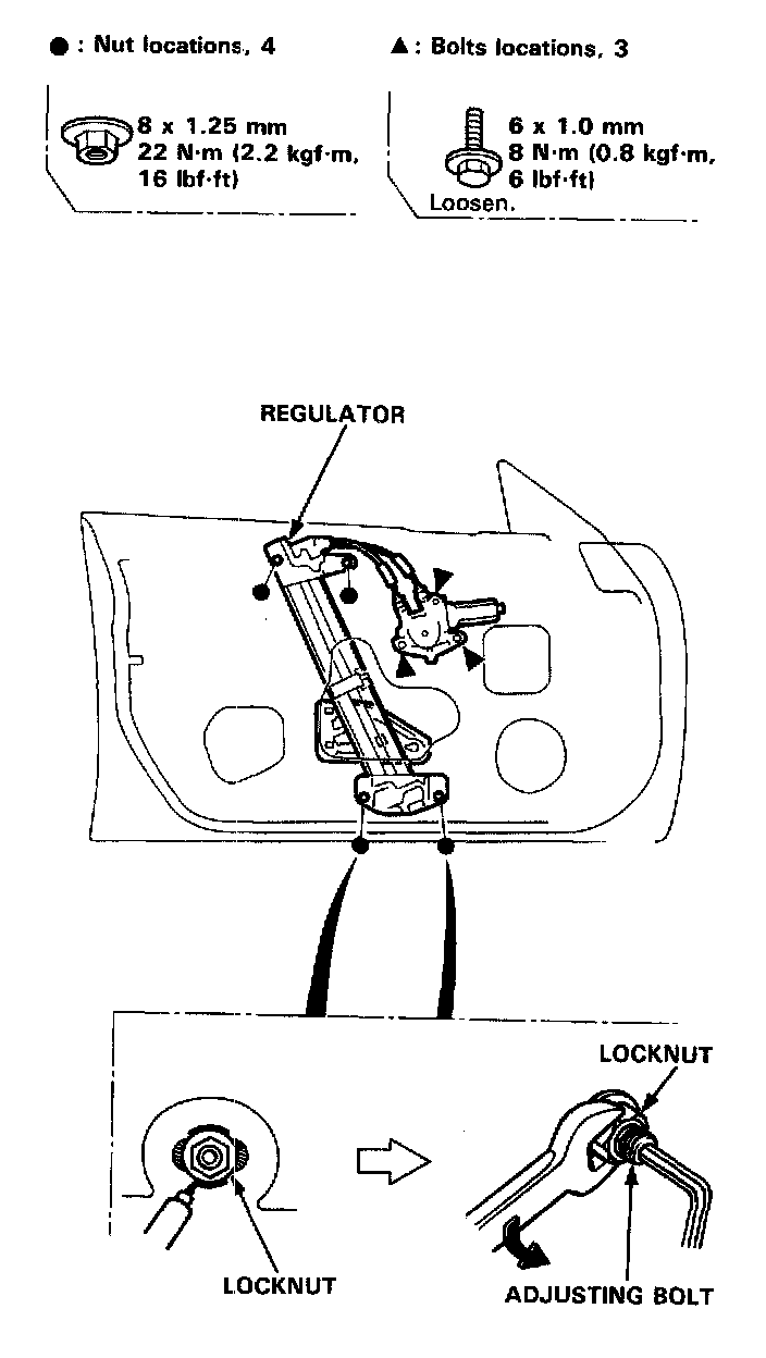 7. Disconnect the connector, and remove the regulator through the center hole in the door.