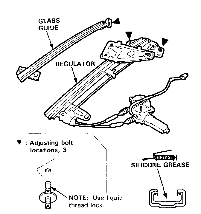 9. Grease all the sliding surfaces of the regulator and glass guide where shown.
