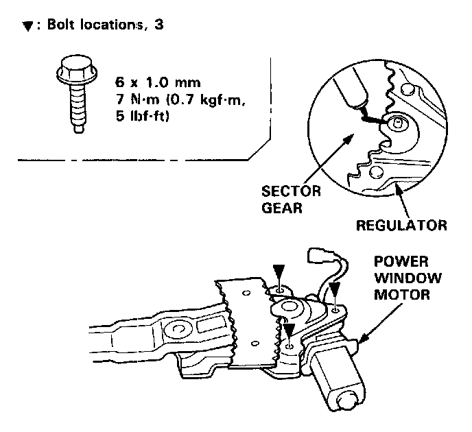 NOTE: Before removing the power window motor, mark the location by scribing a line across the sector gear and regulator.