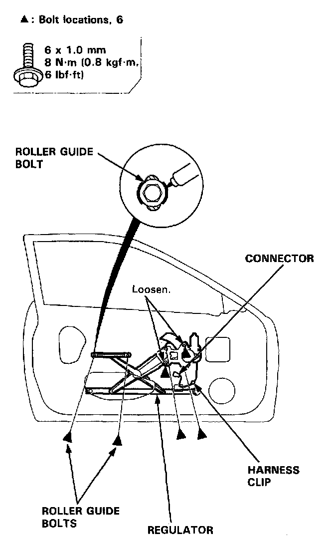 8. Disconnect the connector, then remove the regulator through the center hole in the door.