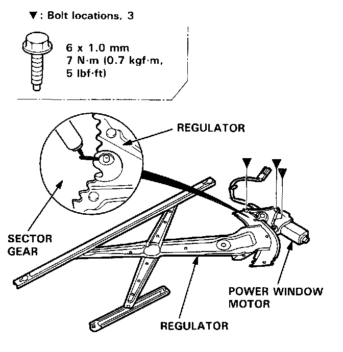 NOTE: Before removing the power window motor, mark the location by scribing a line across the sector gear and regulator.