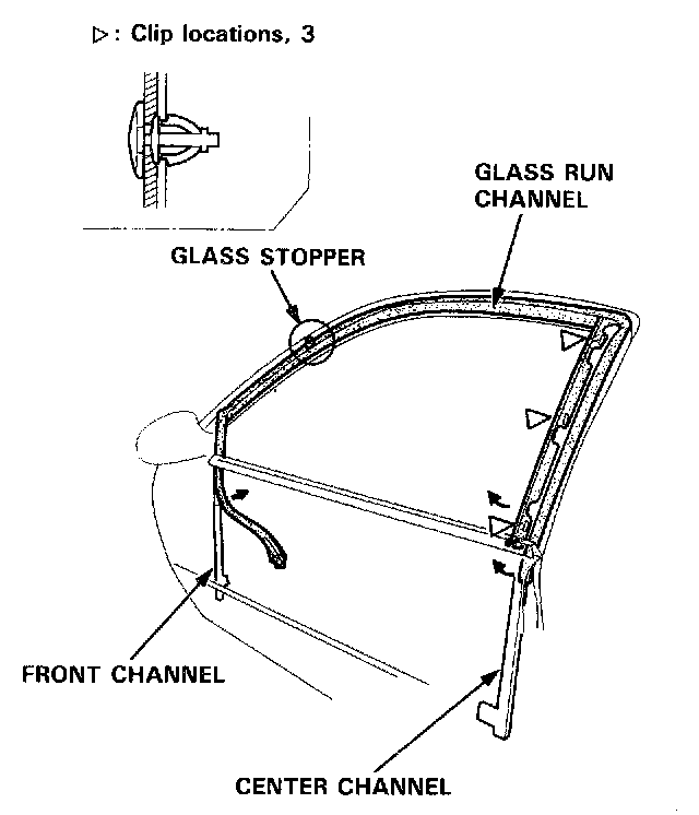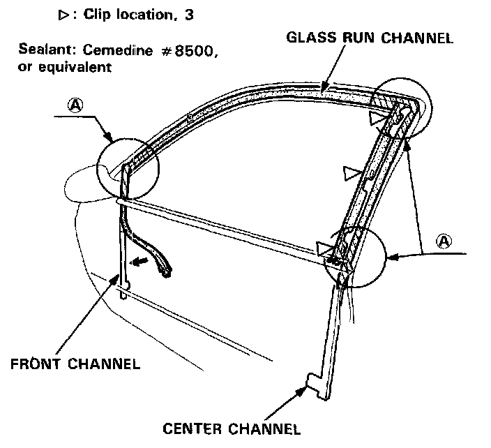 12. Apply clear sealant to locations (A) on the door as shown, then install the glass run channel.