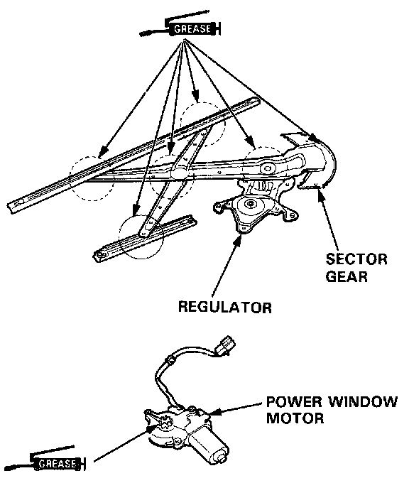 11. Grease all the sliding surfaces of the regulator where shown. Install the power window motor on the regulator.