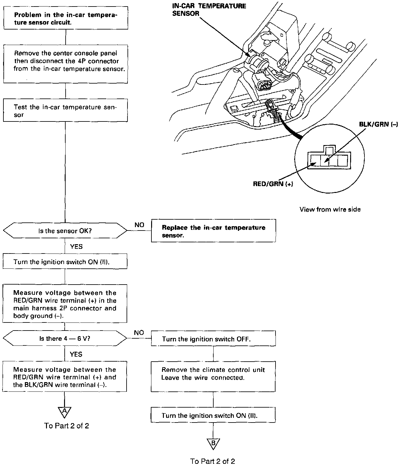 The in-car temperature sensor is a temperature dependent resistor (thermistor). The resistance of the thermistor decreases as the temperature inside the vehicle increases.