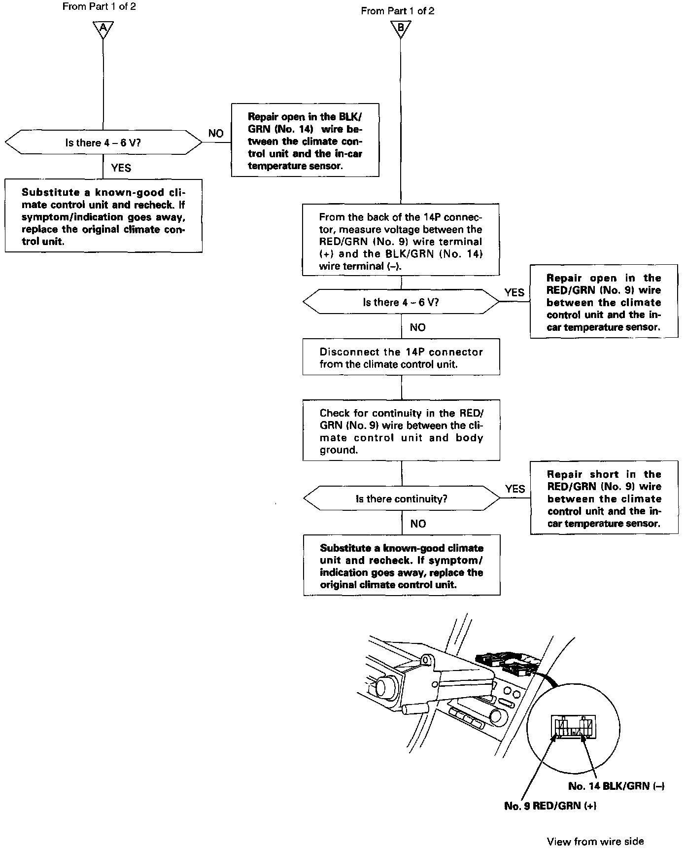 Compare the resistance reading between the No. 1 and No. 2 terminals of the in-car temperature sensor with specifications shown in the graph: It should be within specification.