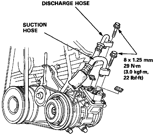 6. Disconnect the suction and discharge hoses from the compressor. Cap the open fittings immediately to keep moisture and dirt out of the system.