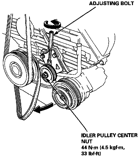 7. Loosen the idler pulley center nut and adjusting bolt, then remove the belt from compressor.