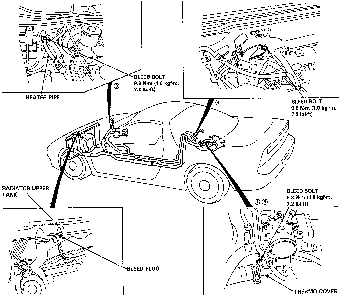 10. Fill the expansion tank with engine coolant. As coolant starts to run out in a steady stream without bubbles, tighten the bleeders in sequence: thermo cover bleed bolt, radiator bleed plug, heater pipe bleed and water pipe bleed bolt.