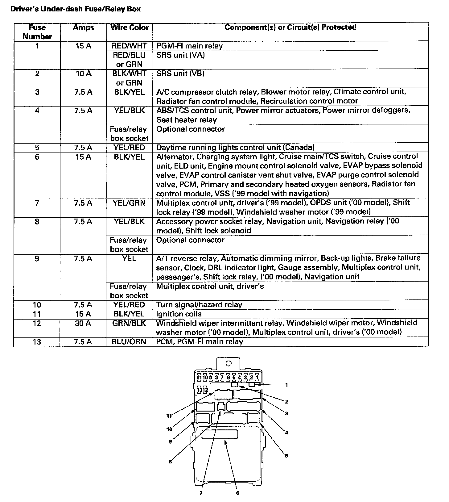 Driver's Under-dash Fuse/Relay Box Fuse to Components Index: