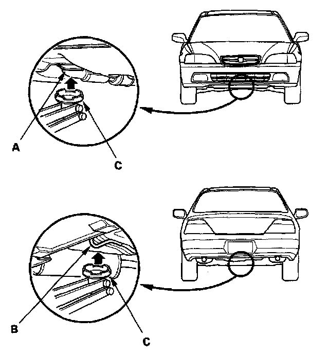 4. Position the floor jack under the front jacking bracket (A) or rear jacking bracket (B), center the jack lift platform (C) on the jacking bracket, and jack up the vehicle high enough to fit the safety stands under it.