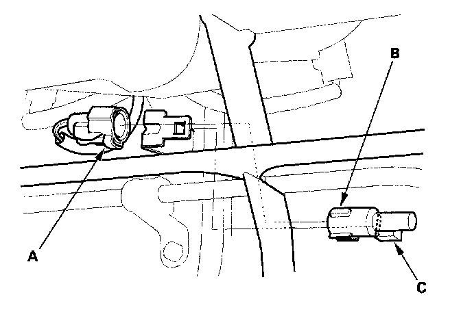 Outside Air Temperature Sensor Replacement1. Disconnect the 2P connector (A) from the outside air temperature sensor(B). Lift the tab (C) to release the lock, and remove the outside air temperature sensor.