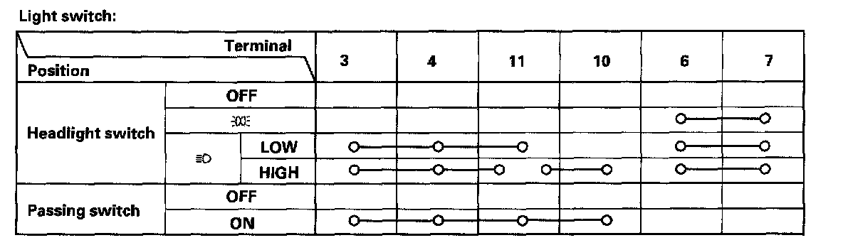 - If the terminals look OK, check for continuity between the terminals in each switch position according to the tables.