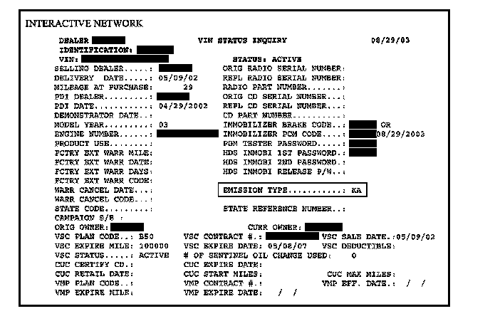 4. From the VIN Status Inquiry screen, enter the VIN, and then click on Submit. On the VIN Status Inquiry, the vehicle's emission type is displayed below the immobilizer information.