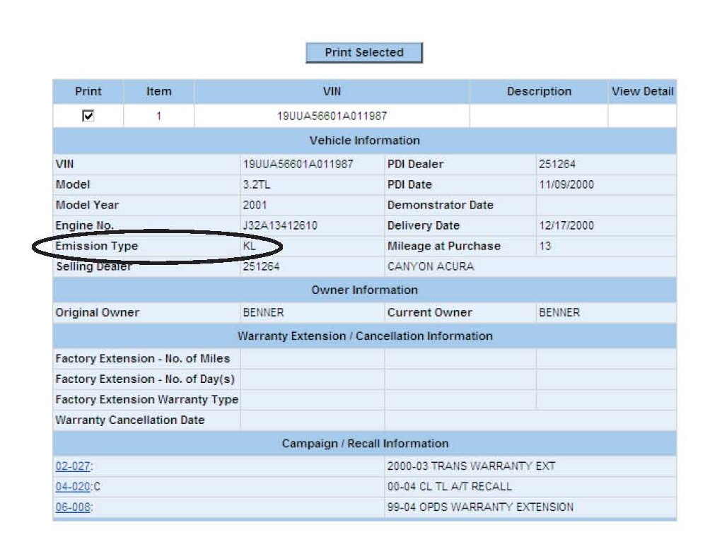 ^ Enter the VIN on the VIN Inquiry screen, then click on Submit. You will see the vehicle's emissions type below the engine number.
