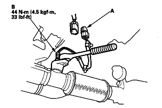 1. Disconnect the primary HO2S 4P connector (A), then remove the primary HO2S (B).