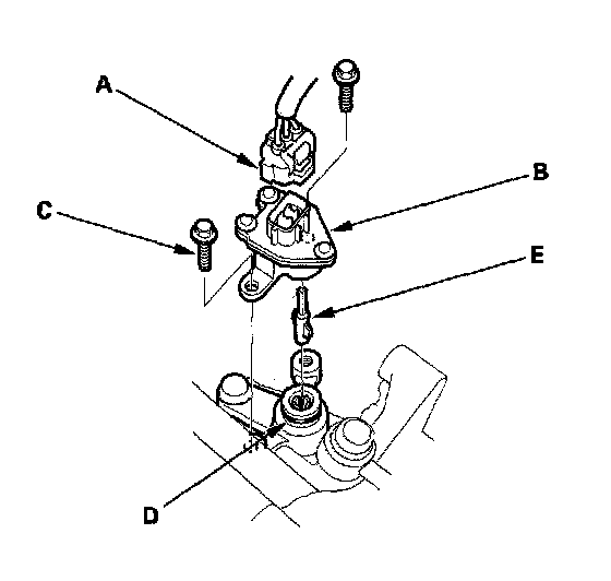3. Install the VSP. Lubricate the new O-ring (D) and the vehicle speed pulse (VSP) sensor joint (E) with grease before installing.