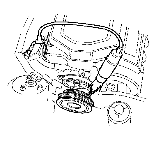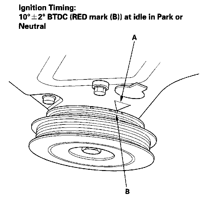 5. Point the light toward the pointer (A) on the timing belt cover. Check the ignition timing under no load conditions: headlights, blower fan, rear window defogger, and air conditioner are not operating. If the ignition timing differs from the specification given, replace the power-train control module (PCM).