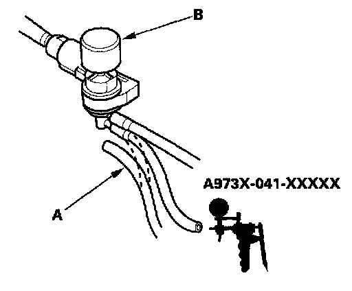 10. Disconnect the lower vacuum hose (A) from the engine mount control solenoid valve (B), and connect a vacuum pump/gauge to the hose. Apply vacuum for 20 seconds.