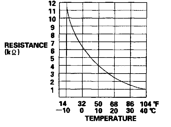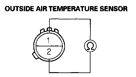 Compare the resistance reading between the No. 1 and No. 2 terminals of the outside air temperature sensor with the specifications shown in the graph; the resistance should be within the specifications.