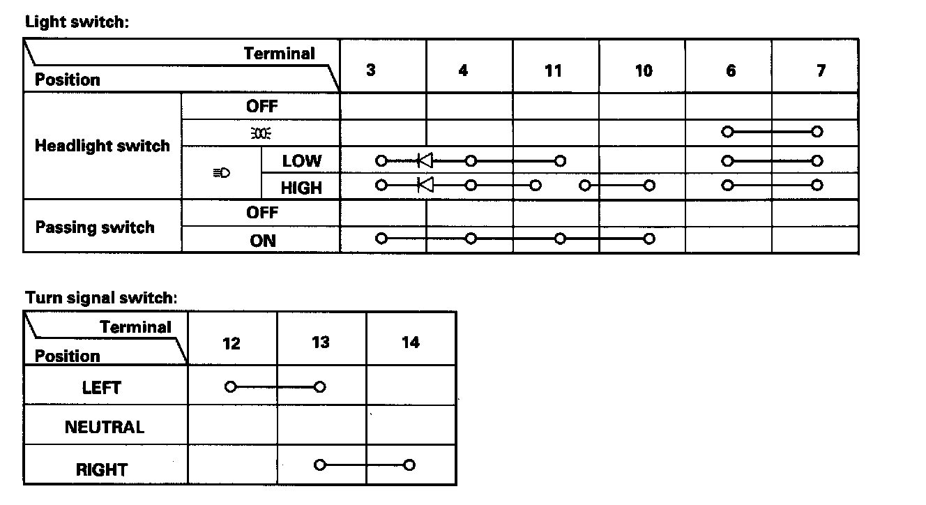 - If the terminals look OK, check for continuity between the terminals in each switch position according to the tables.