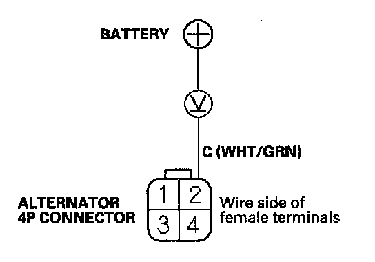 4. Measure voltage between the alternator 4P connector terminal No.2 and the positive terminal of the battery.