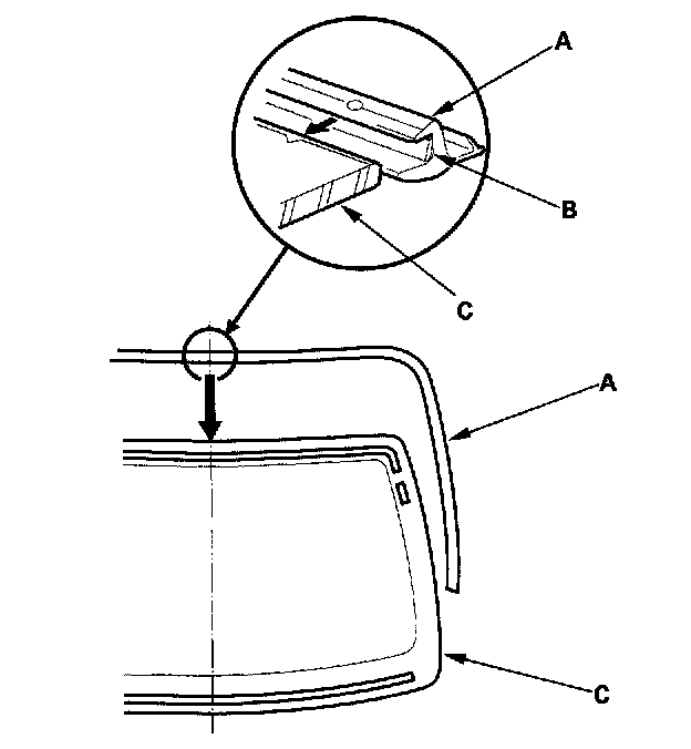 16. Glue the molding (A) with adhesive tape (B) to the edge of the glass (C), windshield, rear window. Be careful not to touch the glass where adhesive will be applied.