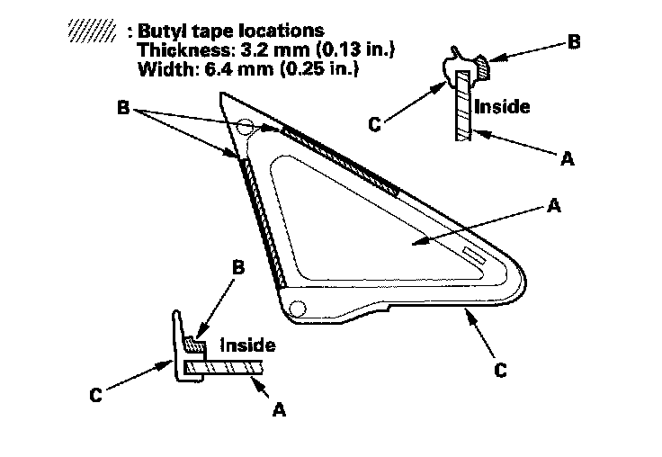 17. If the old glass (A) is to be reinstalled (and any of the irreplaceable clips are broken off the molding), apply a light coat of primer (C-100, or equivalent), then apply butyl tape (B) to the molding (C) as shown, quarter glass.