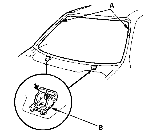 19. If new glass is to be installed, set the glass (A) in the opening, and center it. Make alignment marks (B) across the glass and body with a grease pencil. If the glass has alignment clips, alignment marks are not needed. Be careful not to touch the glass where adhesive will be applied.