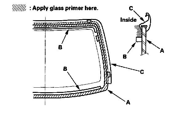 22. With a sponge, apply a light coat of glass primer around the edge of the glass (A) between the rubber dam (B) and molding (C) as shown, then lightly wipe it off with gauze or cheesecloth, windshield, rear window, quarter glass.