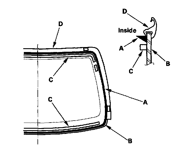26. Pack adhesive into the cartridge without air pockets to ensure continuous delivery. Put the cartridge in a caulking gun, and run a bead of adhesive (A) around the edge of the glass (B) between the rubber dam (C) and molding (D) as shown, windshield, rear window, quarter glass. Apply the adhesive within 30 minutes after applying the glass primer. Make a slightly thicker bead at each corner.