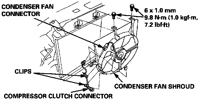 4. Disconnect the condenser fan connector. Disconnect the compressor clutch connector, then remove the compressor clutch connector and the clips from the condenser fan shroud. Remove the two mounting bolts and the condenser fan shroud.