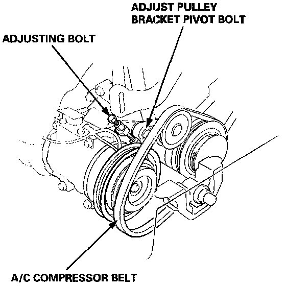6. Loosen the adjust pulley bracket pivot bolt and the adjusting bolt, then remove the A/C compressor belt from the pulley as shown.