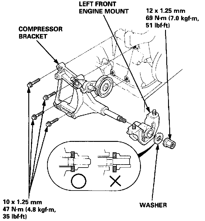 NOTE: When tightening the engine mount nut, make sure the washer is set properly on the left front engine mount as shown.