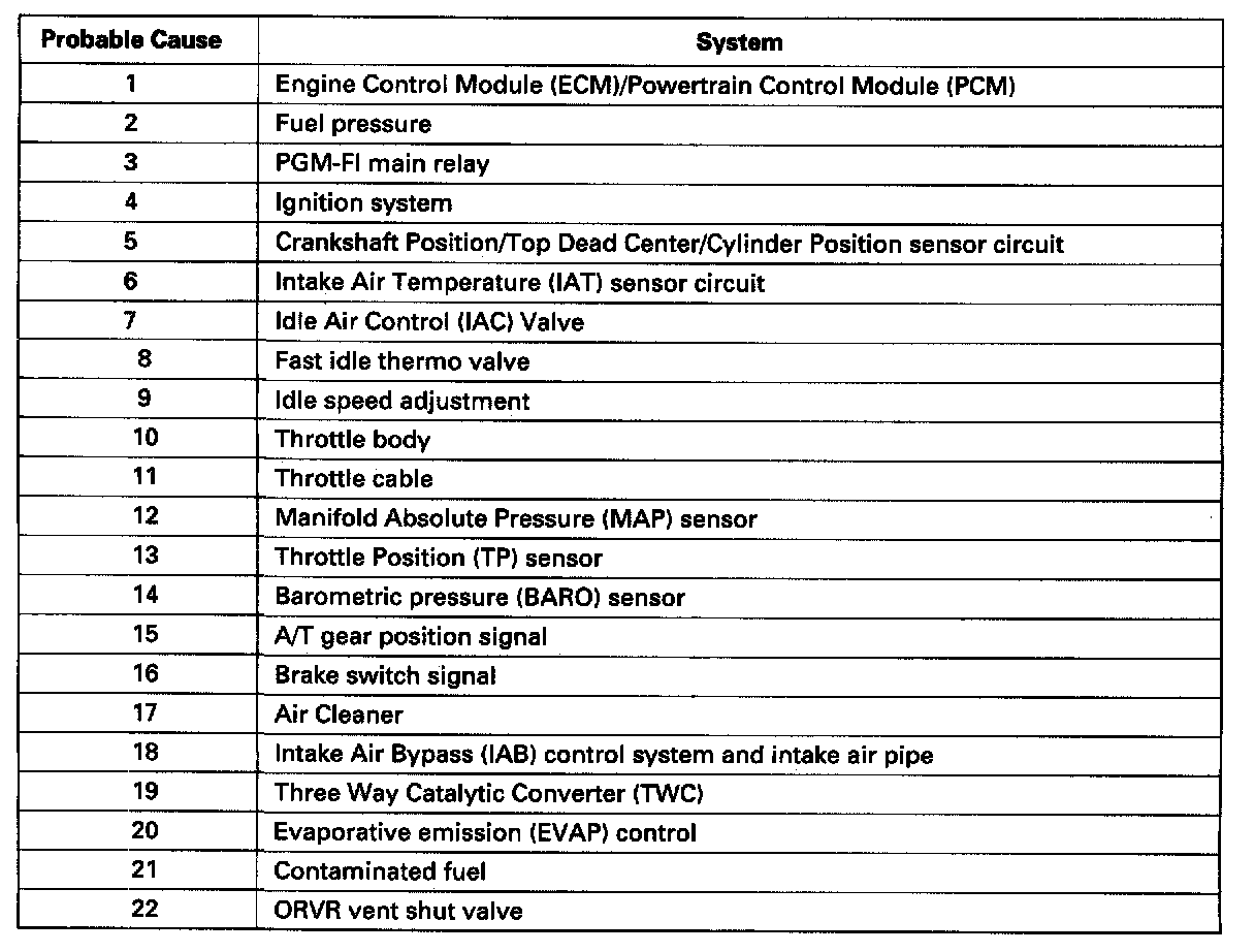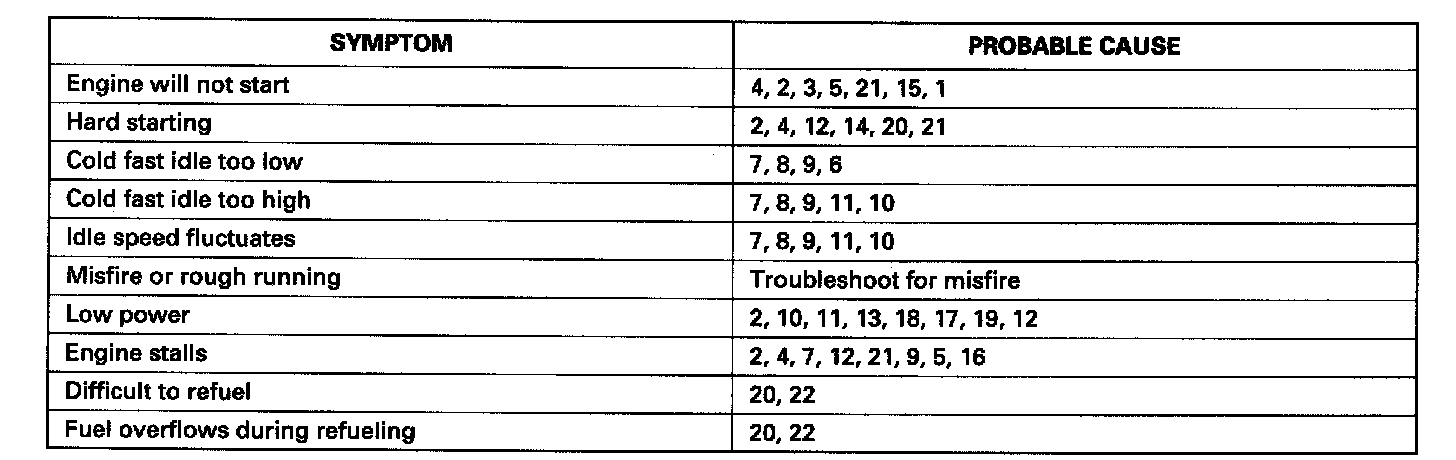 The table shows symptoms and probable causes for problems. When the chart refers you to a probable cause, see the appropriate system diagnosis for that component or system.