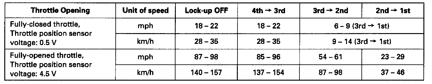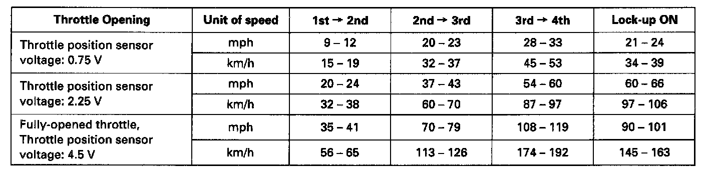 4. Test-drive the vehicle on a flat road in the D4 position. Check that the shift points occur at approximate speeds shown on a flat road. Also check for abnormal noise and clutch slippage.