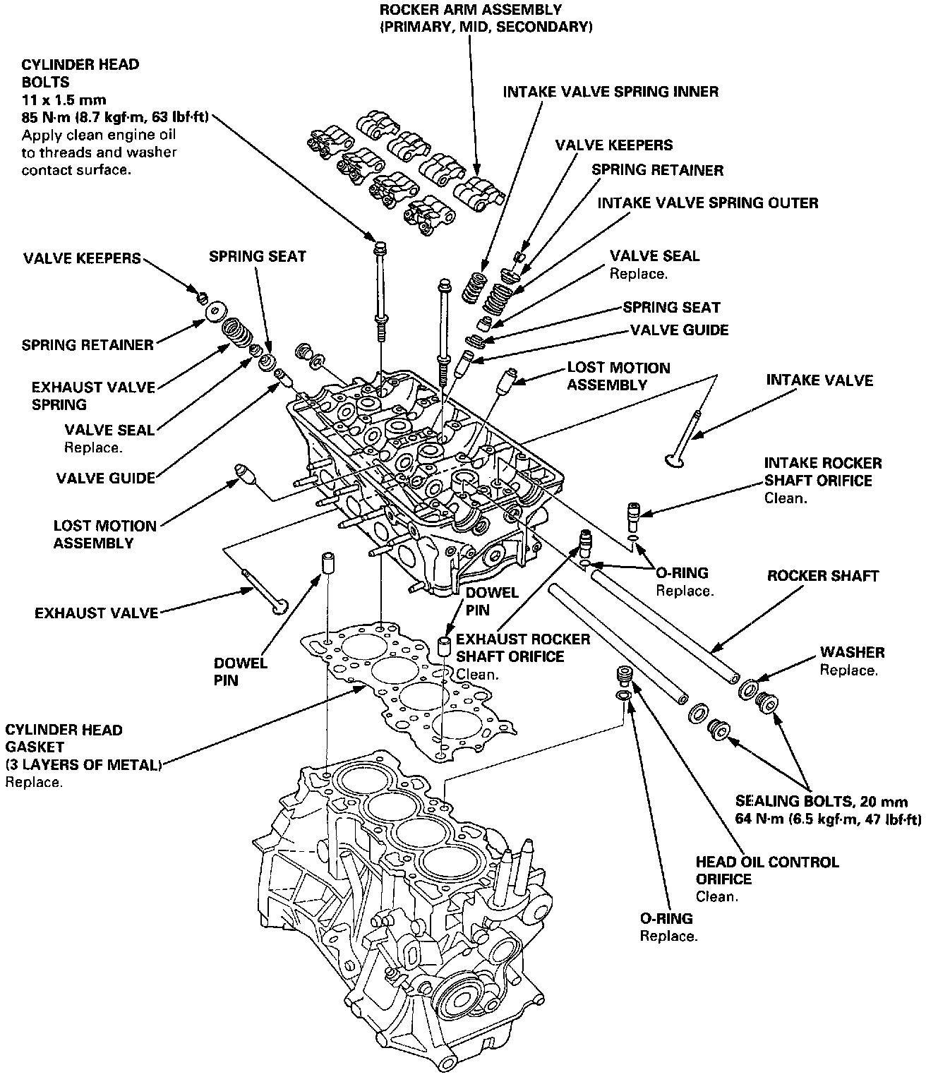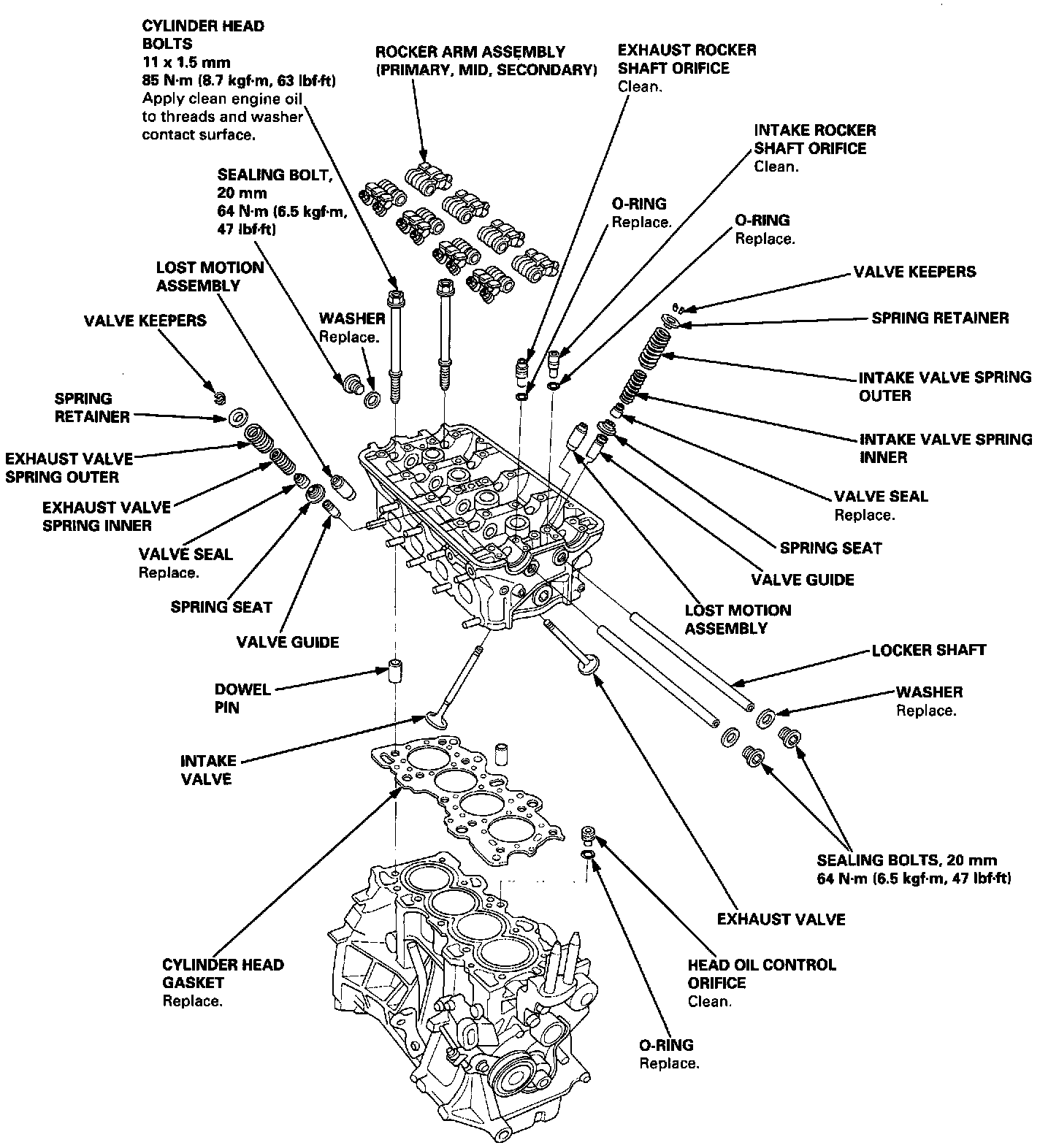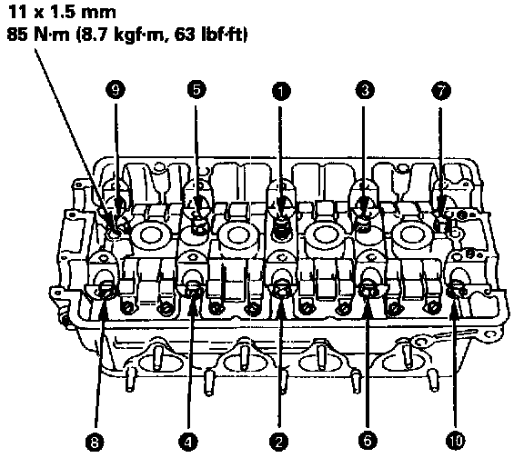 Tighten cylinder head bolts in two steps. In the first step, tighten all bolts in sequence to about 29 Nm (3.0 kgf.m, 22 ft. lbs.). In the final step, tighten in same sequence to 85 Nm (8.7 kgf.m, 63 ft. lbs.).