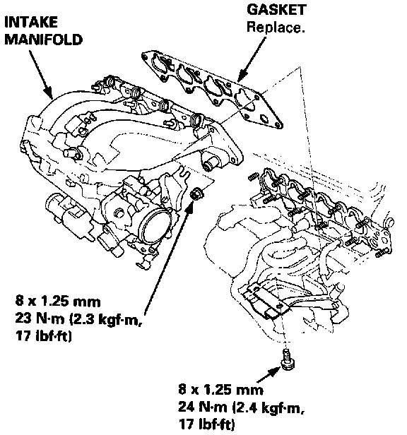 Install the intake manifold and tighten the nuts in a crisscross pattern in two or three steps, beginning with the inner nuts.