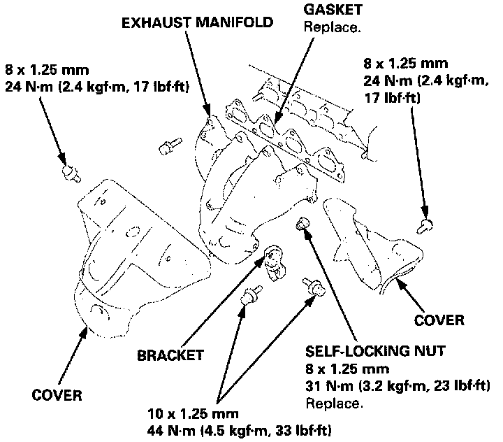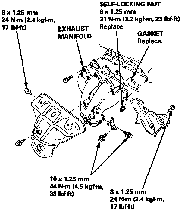 Install the exhaust manifold and tighten the new self-locking nuts in a crisscross pattern in two or three steps, beginning with the inner nuts.