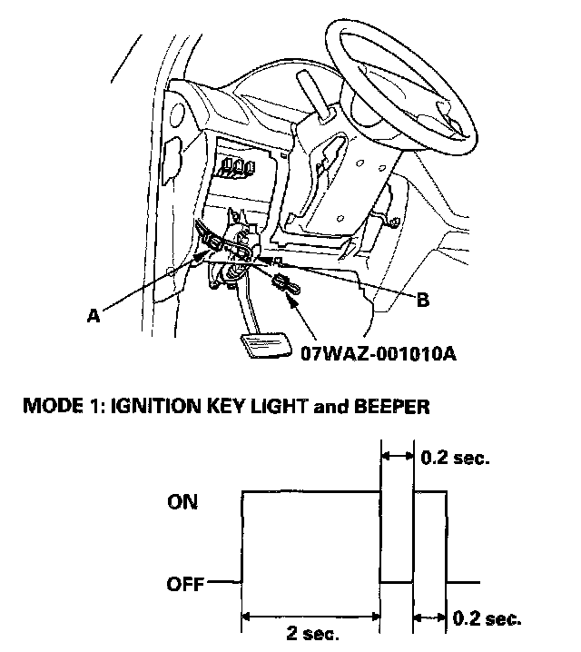 3. Check self-diagnosis function Mode 1 for a diagnostic trouble code (DTC) by connecting the special tool to the multiplex control inspection connector (A) taped to the brake switch harness (B). After about five seconds, the ignition key light should come on and the beeper should beep for 2 seconds, go off for 0.2 seconds, then blink and beep for 0.2 second. This means that you are in Mode 1 of the self-diagnosis function.