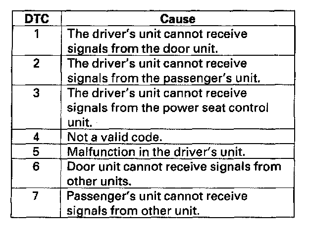 6. One second after you go into self-diagnosis mode 1, the ignition key light and beeper indicate the DTC, and repeat it every 3 seconds. If there is more than one DTC, the system will indicate them in ascending order, beginning from the DTC with the lowest numerical value. Find your DTC in this table, then go to step B and check the communication lines.