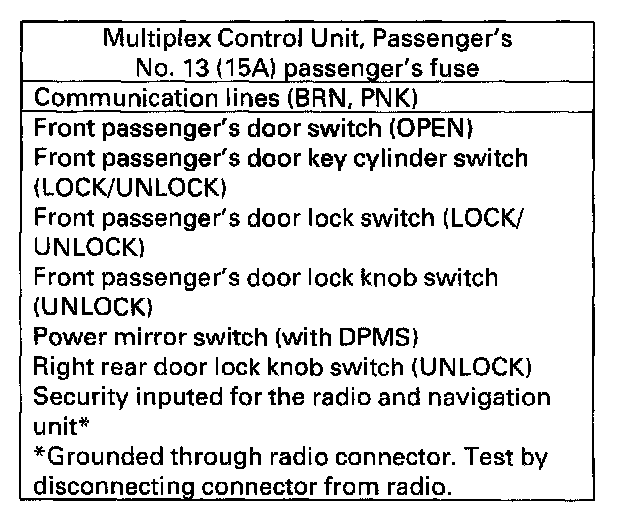 1. Check the driver's No. 9 and the passenger's No. 13 fuses.