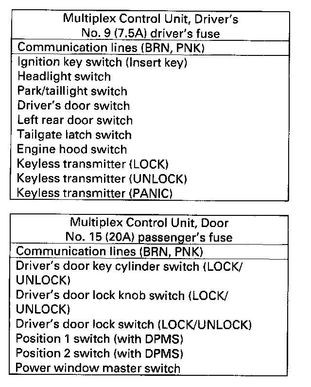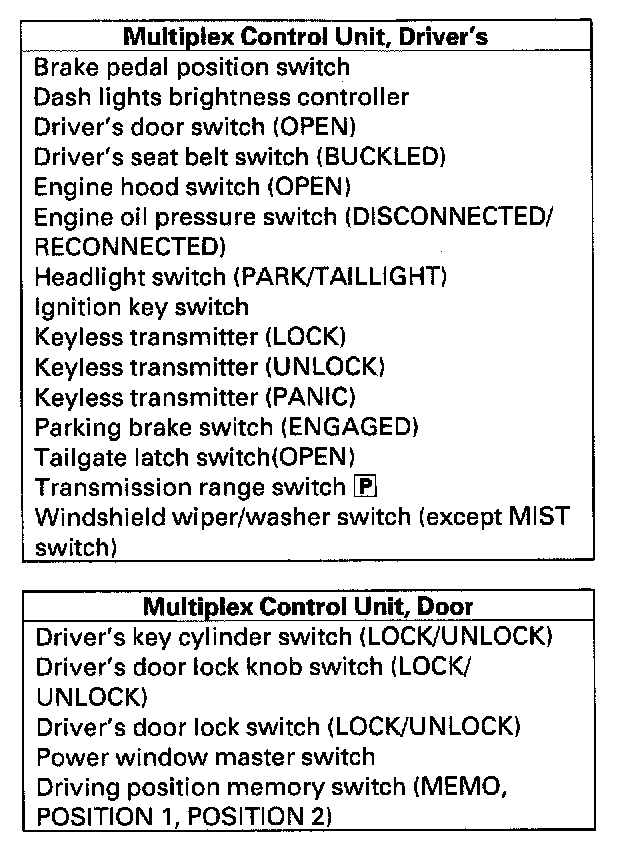 13. Look in the following tables for the switch most closely related to the problem. While still in Mode 2, operate the switches to test the circuits between the switches and its control unit. If the circuit is OK, the ignition key light should blink once and the beeper should beep once. If the circuit is faulty, there will be no indication.