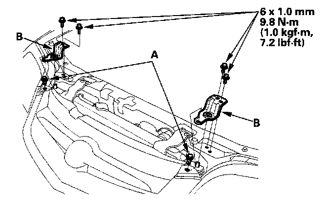 3. Remove the clips (A), then remove the bolts and the radiator upper mount brackets (B).