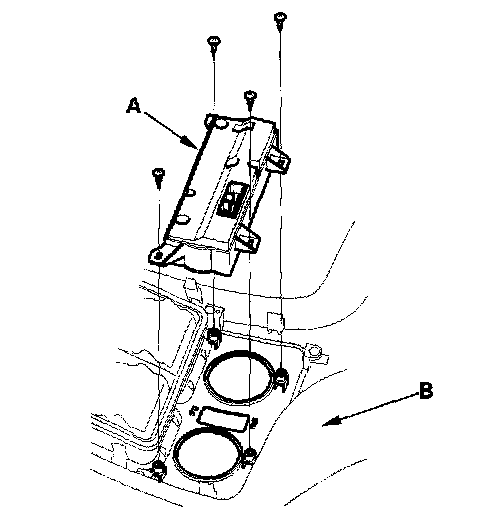 2. Remove the self-tapping screws and the rear heater-A/C control unit (A) from the console rear trim (B).