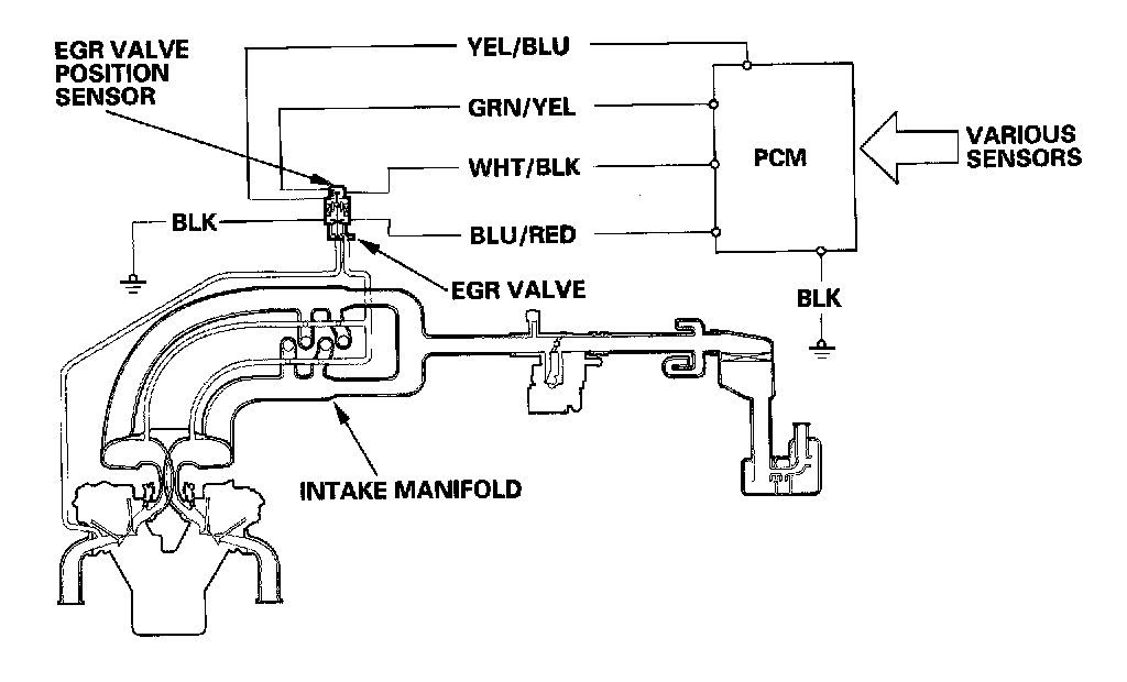 The EGR system reduces oxides of nitrogen (NOx) emissions by recirculating exhaust gas through the EGR valve and the intake manifold into the combustion chambers. The PCM memory includes the ideal EGR valve position for varying operating conditions.