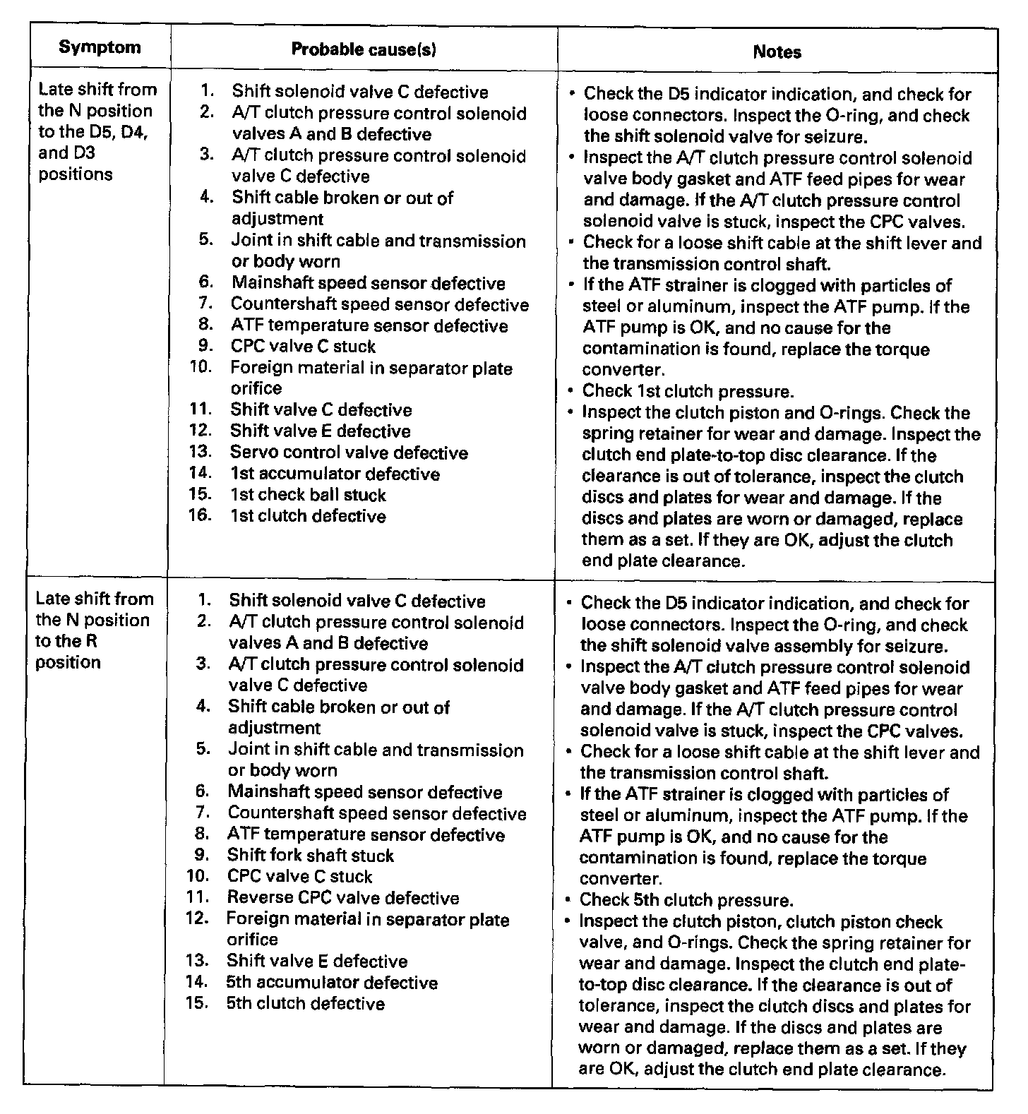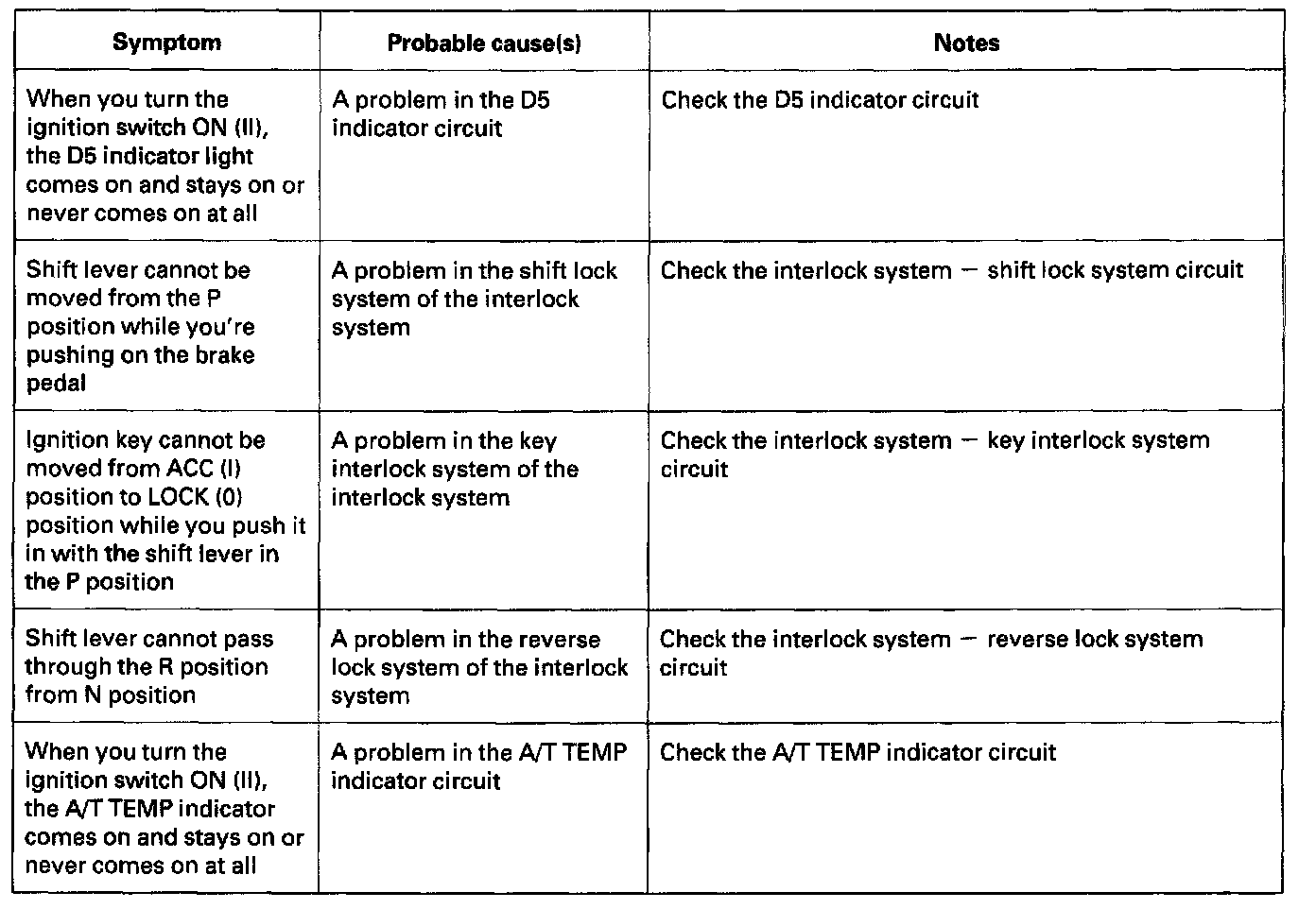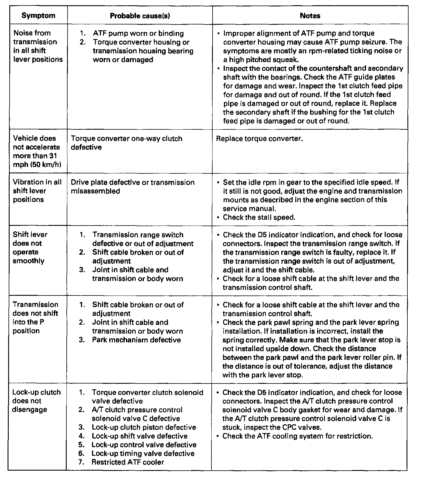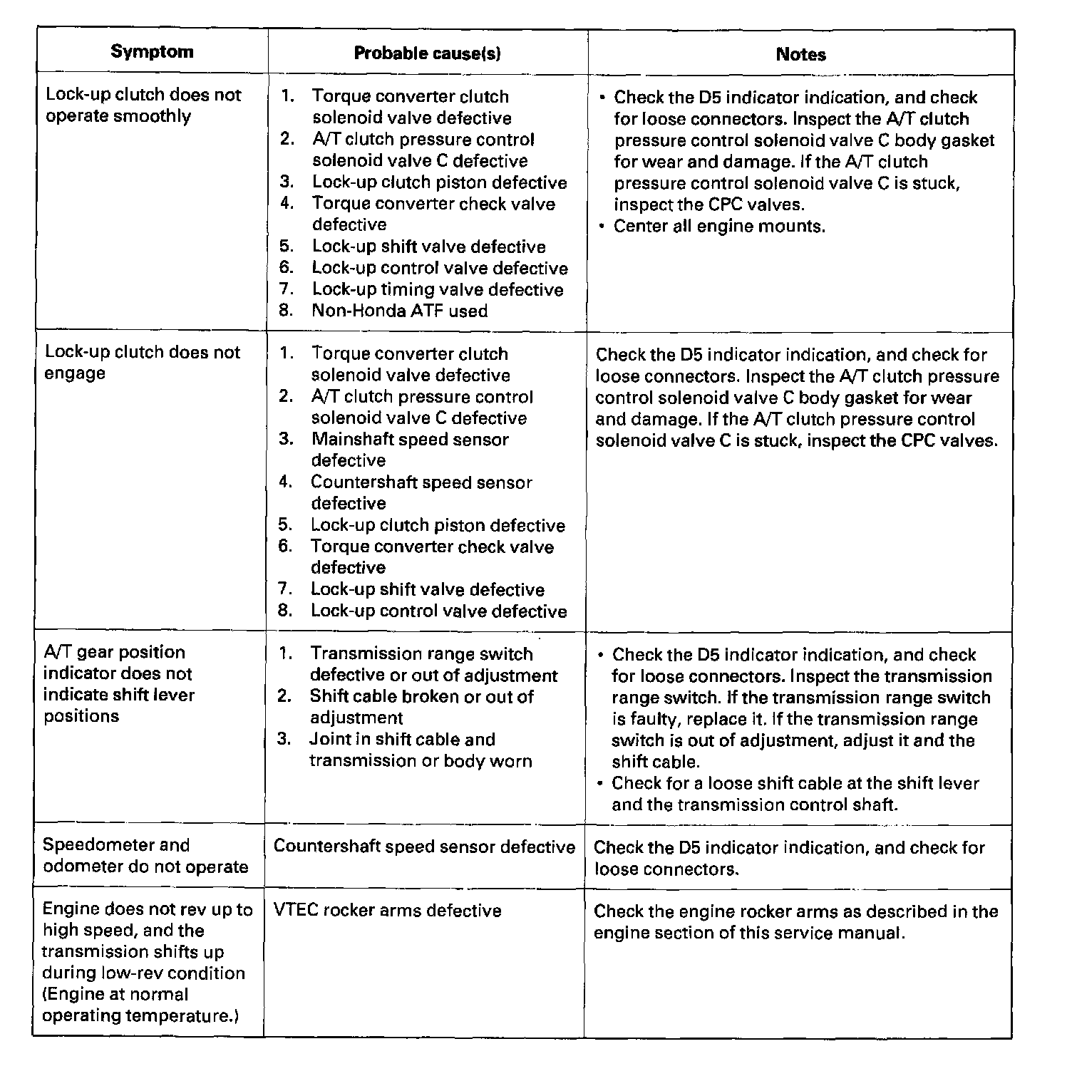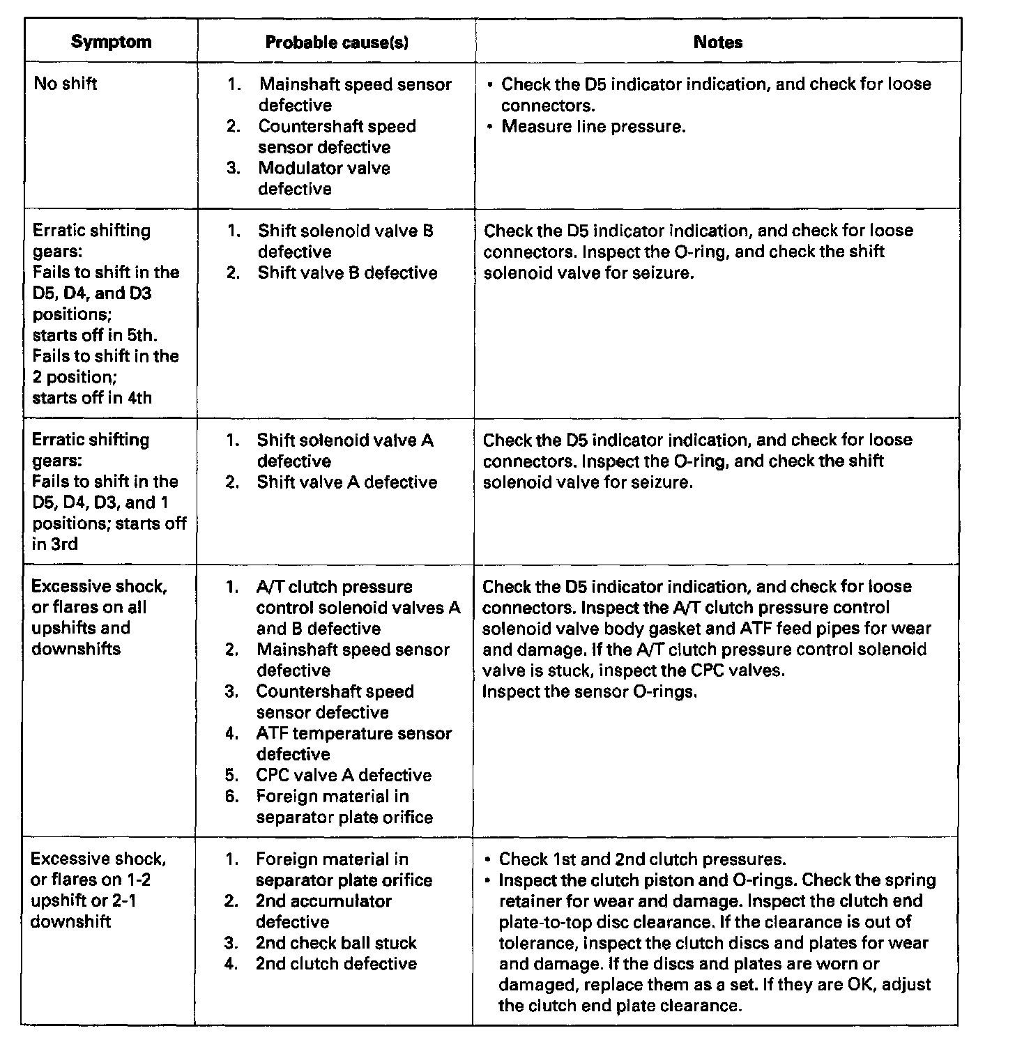 Symptom Troubleshooting IndexThese symptoms DO NOT trigger Diagnostic Trouble Codes (DTCs) or cause the [D5] indicator to blink. If the MIL was reported ON or the [D5] indicator has been blinking, check for DTCs. But if the vehicle has one of the symptoms in the following chart, check the probable cause(s) for it, in the sequence listed, until you find the problem.