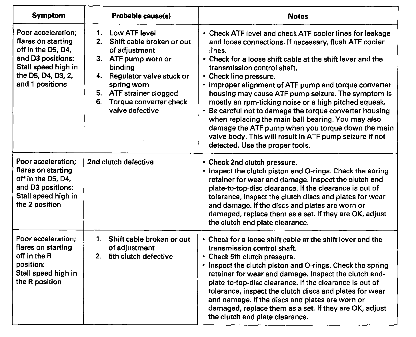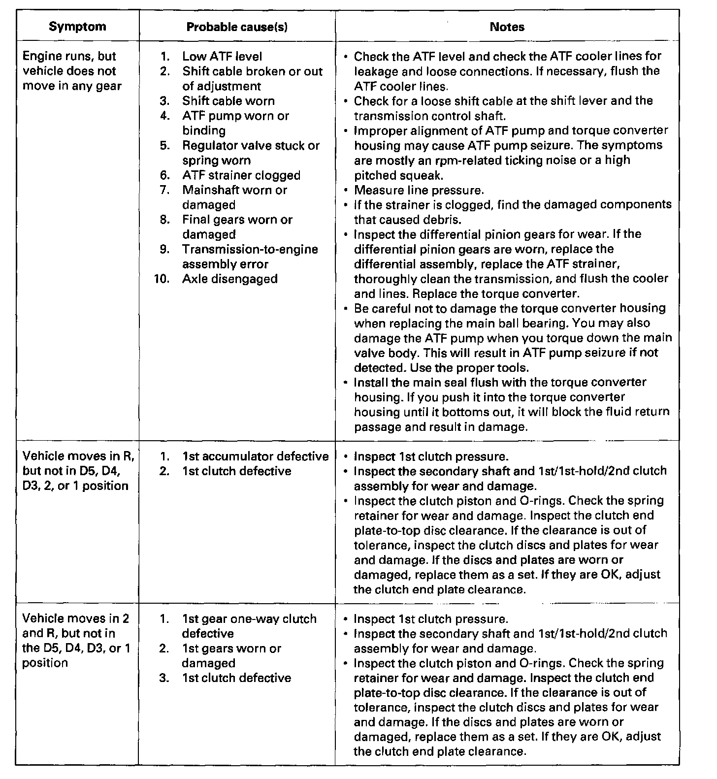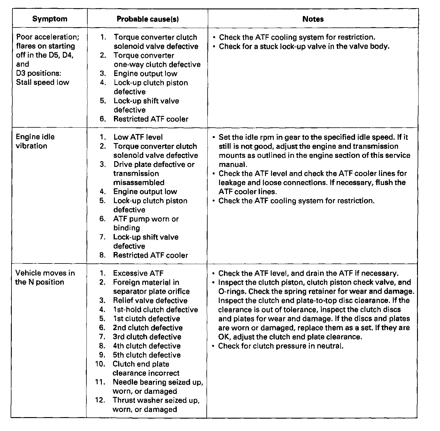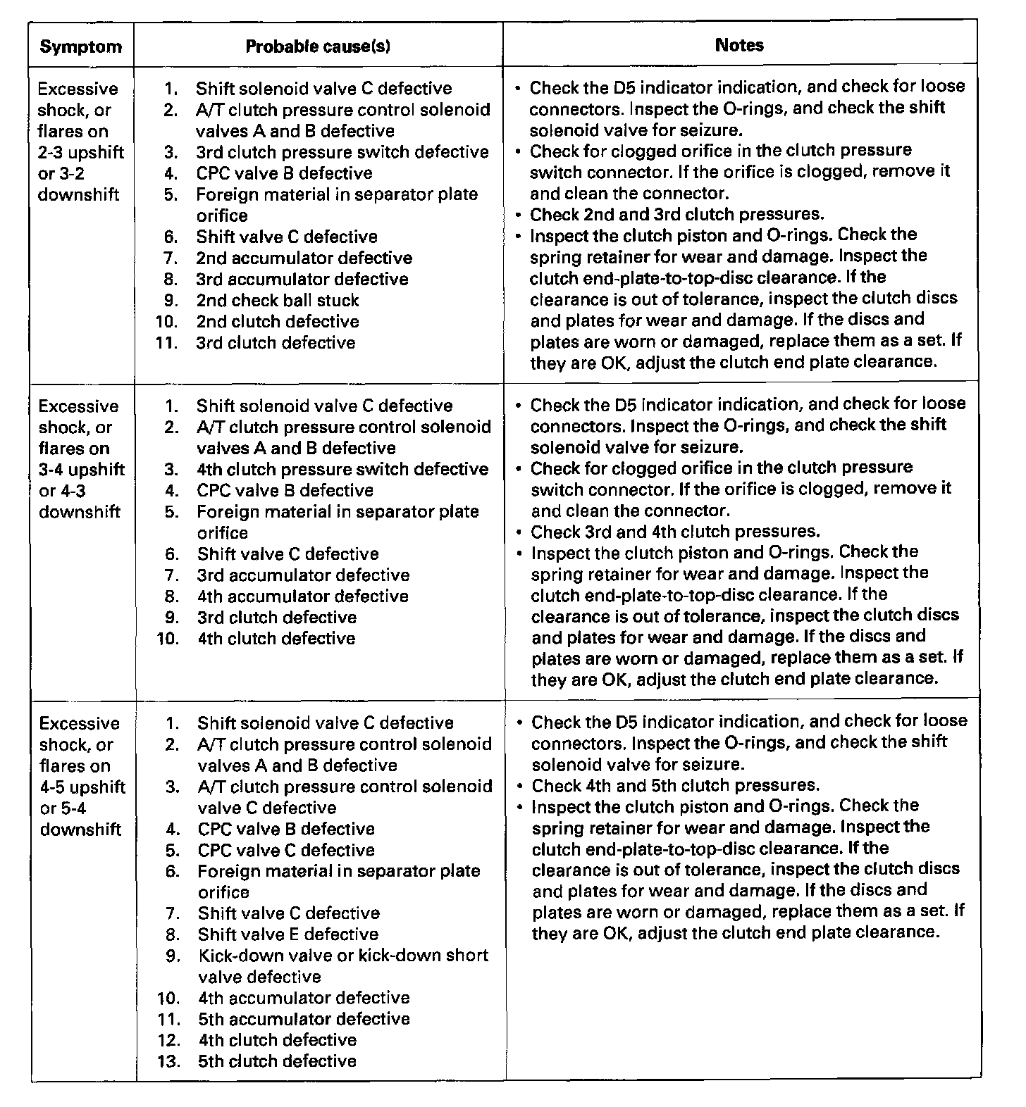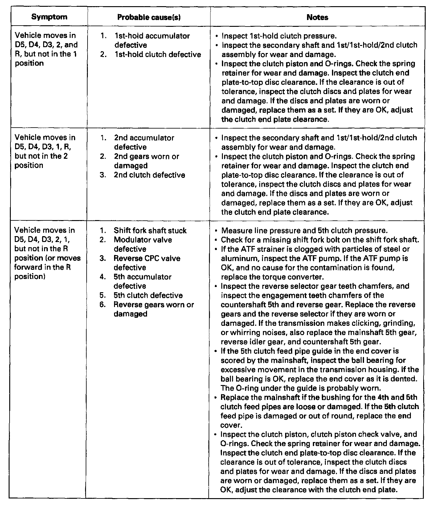 Symptom Troubleshooting IndexThese symptoms DO NOT trigger Diagnostic Trouble Codes (DTCs) or cause the [D5] indicator to blink. If the MIL was reported ON or the [D5] indicator has been blinking, check for DTCs. But if the vehicle has one of the symptoms in the following chart, check the probable cause(s) for it, in the sequence listed, until you find the problem.