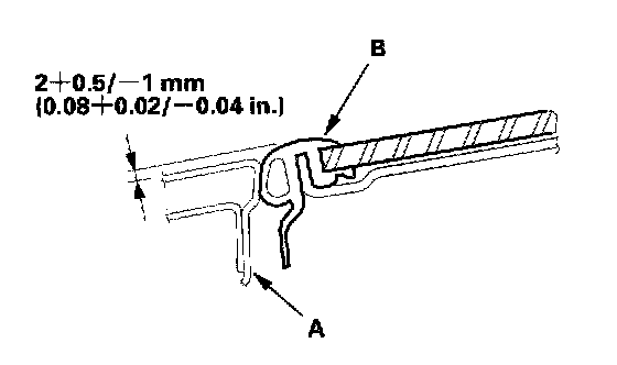 Glass Height AdjustmentThe roof panel (A) should be even with the glass weatherstrip (B), to with in 2 +0.5/-1 mm (0.08+0.02 / -0.04 in.) all the way around. If not, make the following adjustment: