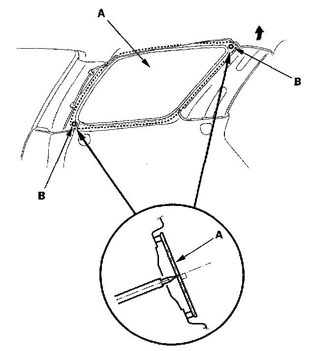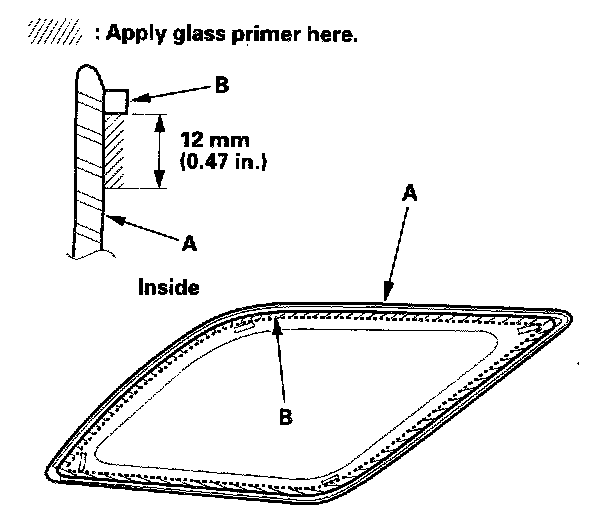 18. Pack adhesive into the cartridge without air pockets to ensure continuous delivery. Put the cartridge in a caulking gun, and run a bead of adhesive (A) around the edge of the glass (B) as shown. Apply the adhesive within 30 minutes after applying the glass primer. Make a slightly thicker bead at each corner.