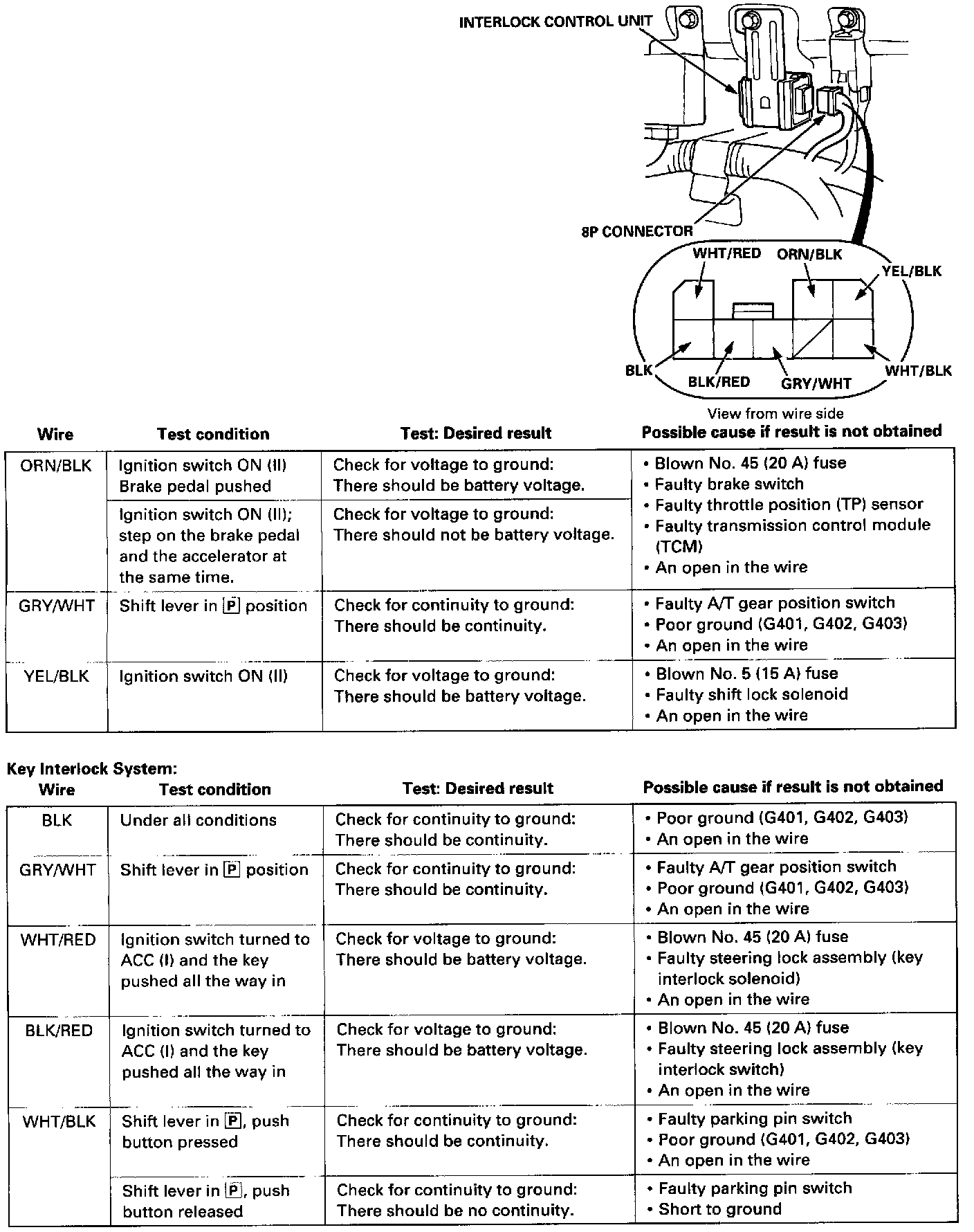NOTE: If the shift lock solenoid clicks when you step on the brake pedal with the ignition switch ON (II) (the shift lever in [P] position), the shift lock system is electronically OK. If the shift lever cannot be shifted from [P] position, see A/T Gear Position Switch Test and Automatic Transmission System.